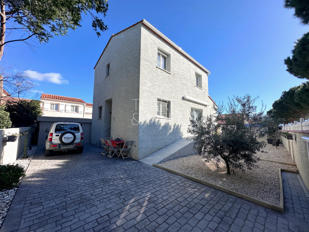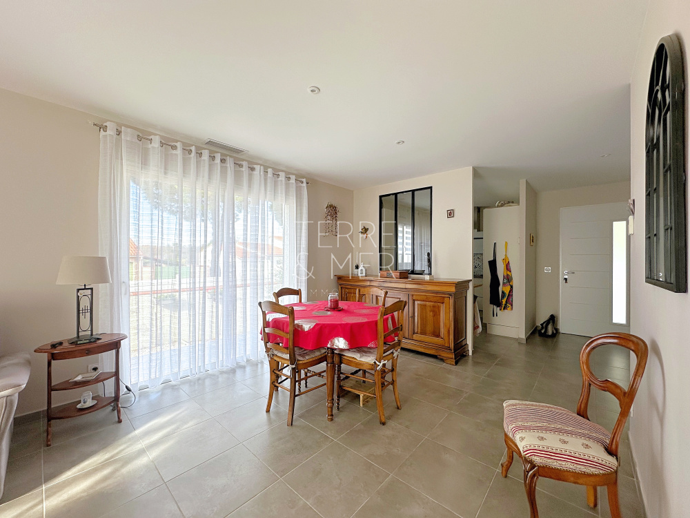 Saint-Cyprien Plage - Villa en 4 faces de construction 2018 édifiée sur une jolie parcelle arborée de 300m2. Cette villa d'une surface habitable de 100m2, se compose en rez-de-chaussée d'un beau séjour avec cuisine semi-ouverte entièrement équipée et aménagée. En suivant une suite parentale, une buanderie et un toilette séparé. A l'étage, deux belles chambres avec placards, un bureau, une salle de bain et un wc indépendant. Le jardin arboré offre une jolie terrasse avec une pergola bioclimatique, un potager ainsi qu'un cabanon de 15m2. Belles prestations: une climatisation réversible gainée, des menuiseries double vitrage, des volets roulants électriques alu, un cumulus thermodynamique et des panneaux solaires. Concernant le stationnement, une place de parking intérieure avec possibilité de garer un camping car. Cette villa se situe proche de la plage et des commerces, rare sur le secteur. Idéal en résidence principale ou secondaire. Les informations sur les risques auxquels ce bien est exposé sont disponibles sur le site Géorisques