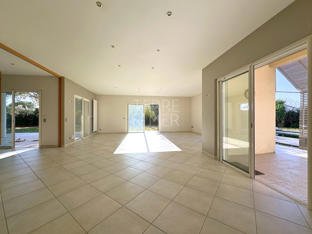 Idéalement située pour une vie de famille tout à pied, à proximité immédiate des écoles et des commerces, cette villa traditionnelle en 4 faces de 2005 offre une configuration rare : 180 m² habitables entièrement de plain-pied aux standards PRM sur une parcelle de 1400 m². D'un état irréprochable, la maison dévoile des volumes généreux. L'entrée dessert une vaste pièce de vie de 55 m², lumineuse grâce à sa triple exposition , s'ouvrant largement sur les extérieurs. La cuisine dinatoire et équipée dispose d'un cellier et d'une séparation par une superbe porte à galandage réalisée sur mesure. L'espace nuit se compose de deux chambres avec salles d'eau privatives, d'une troisième chambre, d'une salle d'eau indépendante et d'un grand dressing (pouvant redevenir une 4ème chambre). Côté extérieur, vous profiterez d'un jardin sans vis-à-vis, d'une piscine au sel et de terrasses ensoleillées. Un grand garage carrelé de 30 m² et plusieurs stationnements complètent ce bien. La villa dispose d'un forage, climatisation réversible, chauffage gaz, menuiseries double vitrage, volets électriques. Une opportunité idéale pour ceux qui recherchent de beaux volumes et la proximité des services. Les informations sur les risques auxquels ce bien est exposé sont disponibles sur le site Géorisques